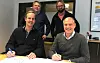 AVTALE: F.v. Ola Holter og Lars Kristian Gaustad (bak) fra Consto Eide AS, sammen med byggherre, Roger Adolfsen, og prosjektleder Arne Henry Sørra.