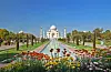 300 × 300 meter stor hage med opphøyede ganger og nedsenkede blomsterrabatter. Mausoleet